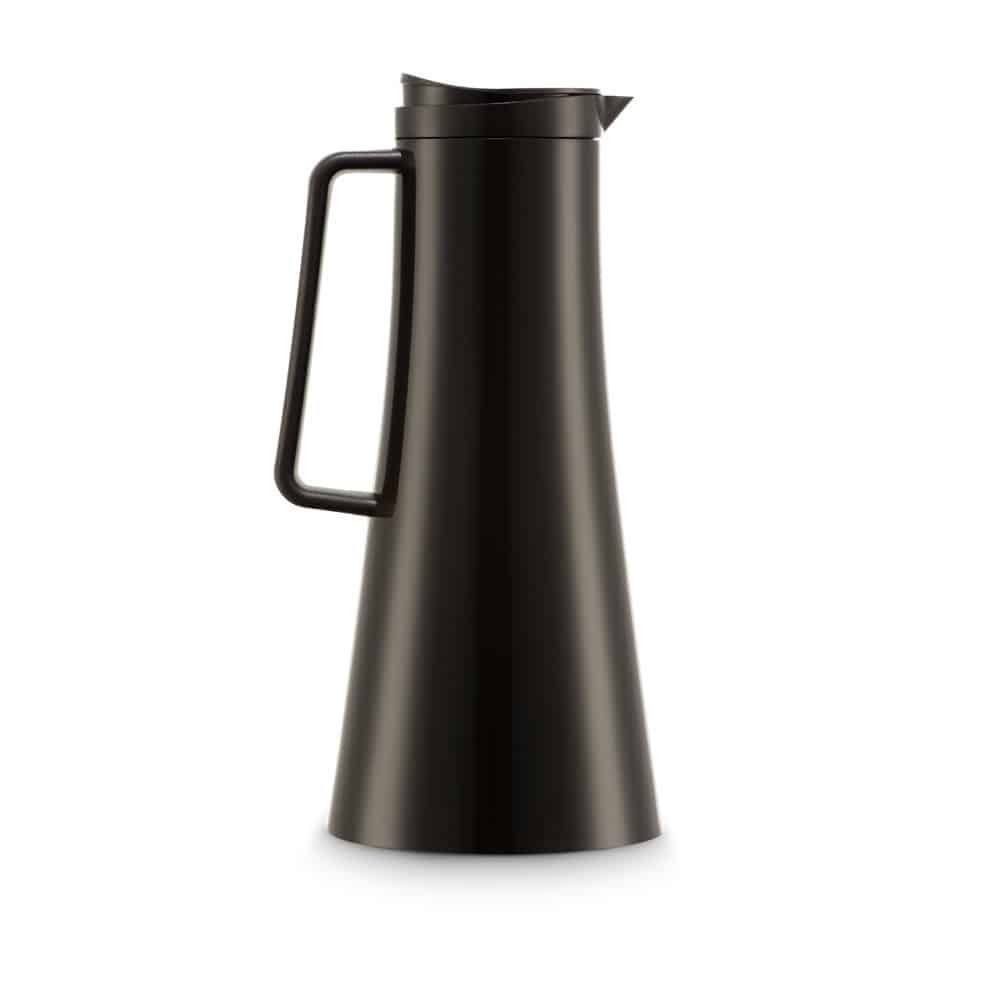 Stainless steel vacuum-insulated kettle. The lid closes automatically after each use to maintain the desired temperature and save energy. An easy press on the lid opens the pitcher and lets the liquids flow. The sleek design of the Bistro makes it the ideal thermos for drinking iced tea in the garden or simply keeping herbal tea hot on the kitchen table. It has a capacity of up to 1’1 L. 158 x 300 x 134 mm