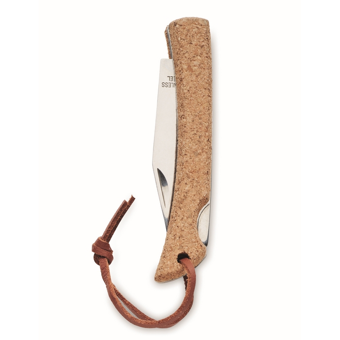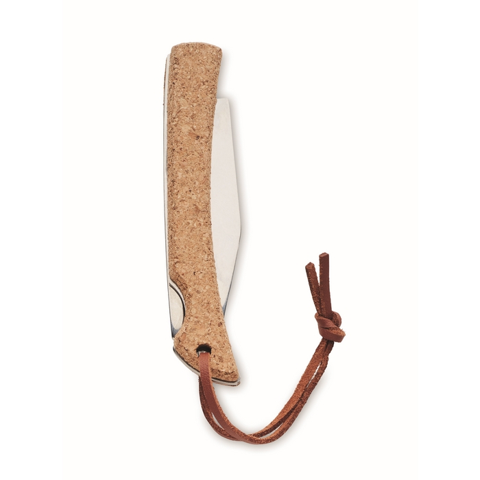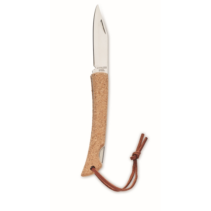Foldable knife in stainless steel and cork covered handle with PU cord. Cork is a natural product, there may be slight variations in colour and size per item, which can affect the final decoration outcome.
