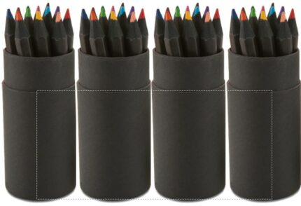 This black coloured paper tube box contains 12 colouring pencils and a pencil sharpener in the lid of the box.