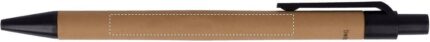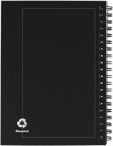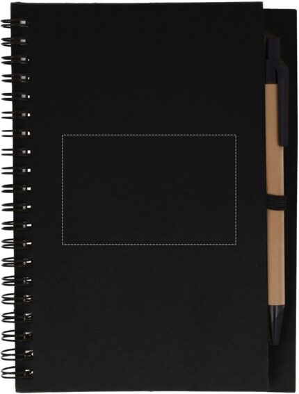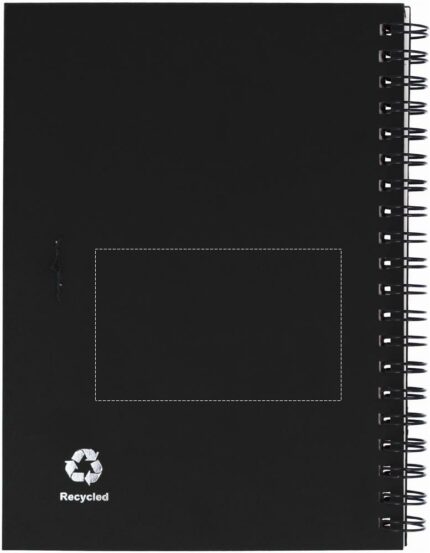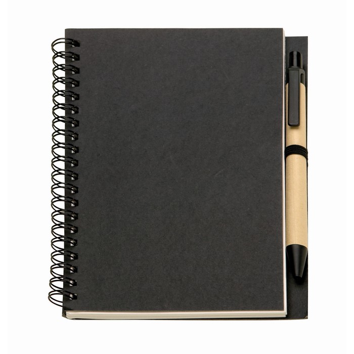 Recycled paper notebook with pen. Twin-wire. 140 plain recycled paper pages (70 sheets). Push button ball pen in recycled carton and biodegradable plastic. Blue ink. Black elastic pen holder.