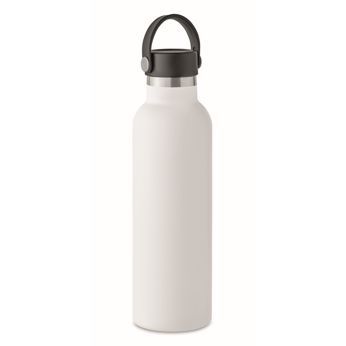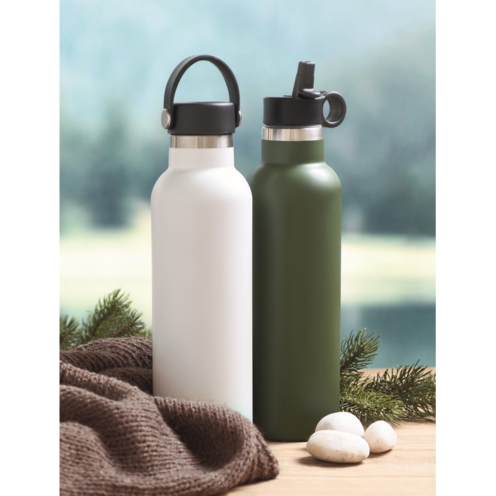 Double wall recycled stainless steel (90% recycled stainless and 10% stainless steel) insulated vacuum bottle with non-leak screw cap and additional interchangeable built-in straw cap. Capacity: 700 ml.