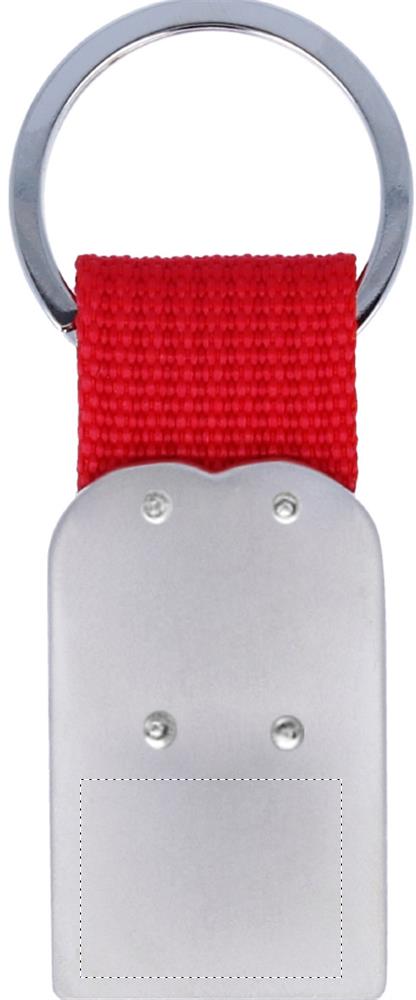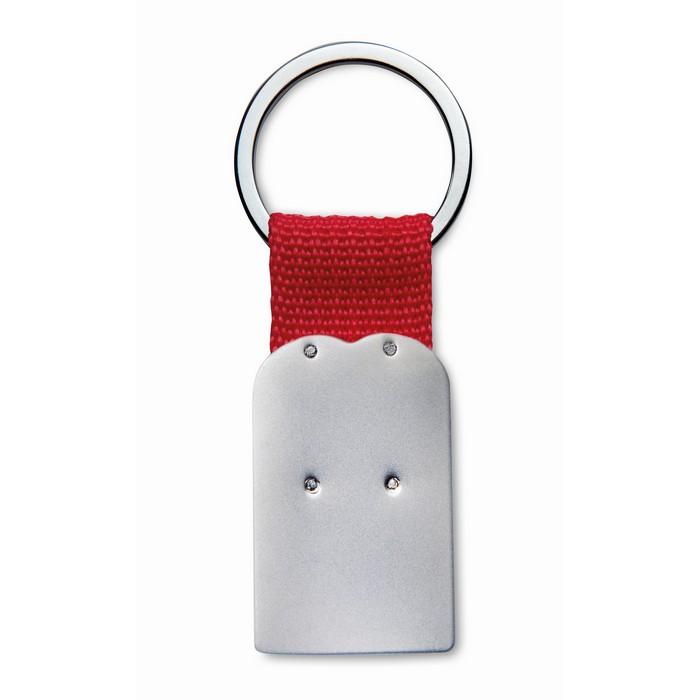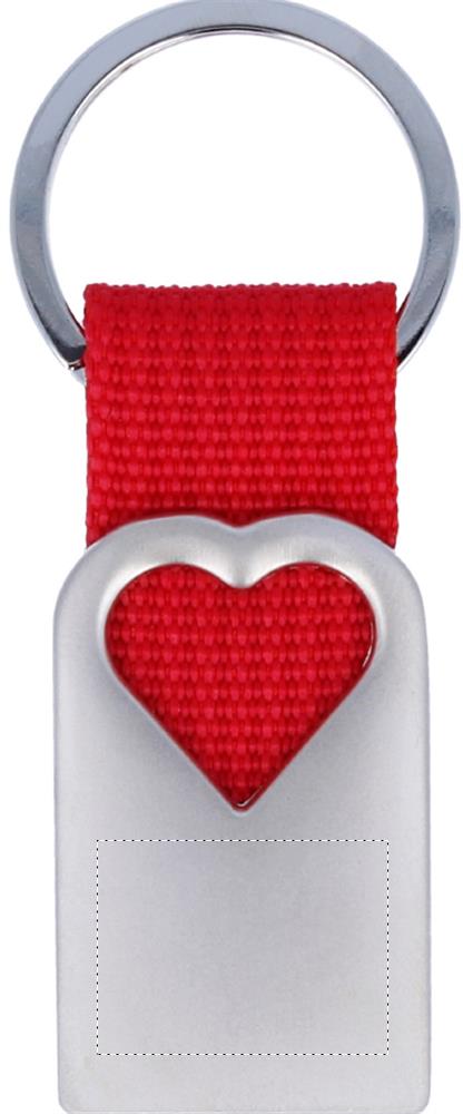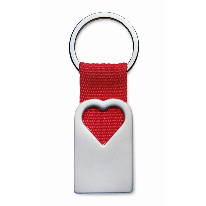 Metal key ring in matt pearl finish in hollow heart shape decoration with polyester webbing holding the metal ring. Individual gift box.