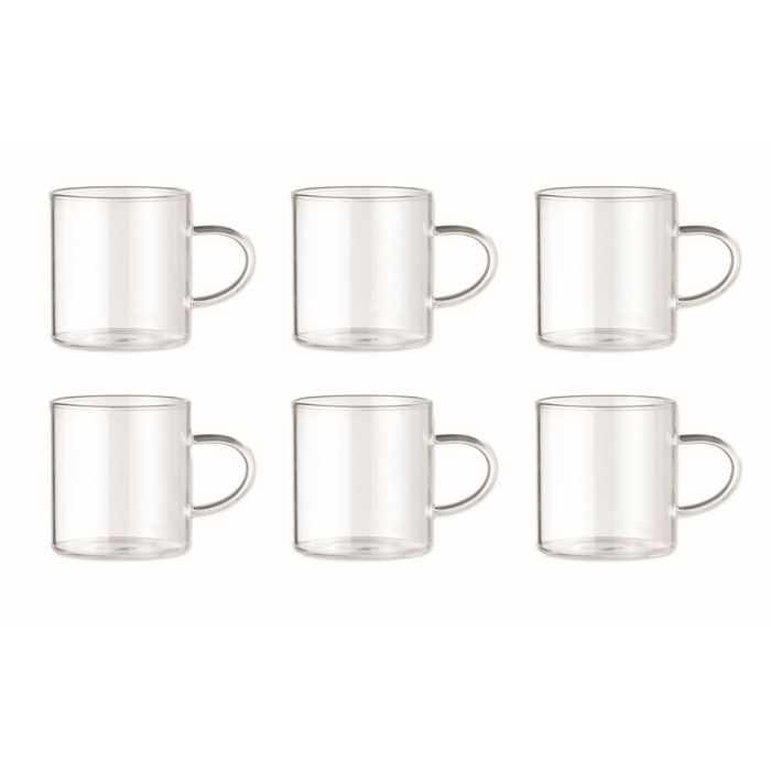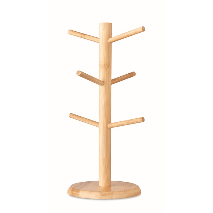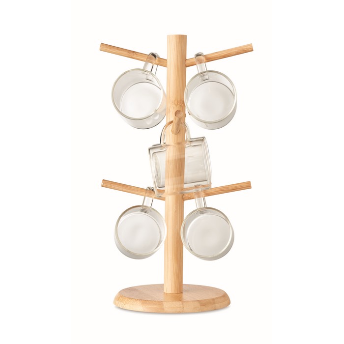 Set of bamboo cup holder including 6 borosilicate glass cups. Capacity: 200 ml per cup. Product assembly required.
