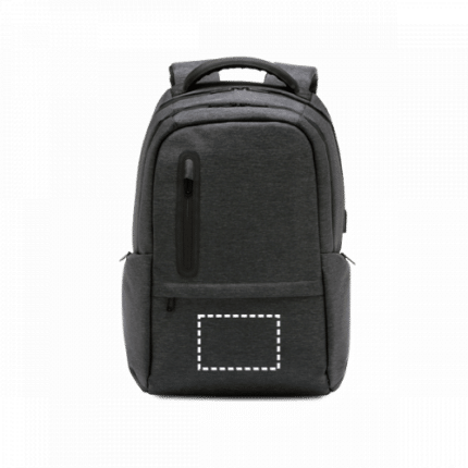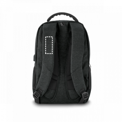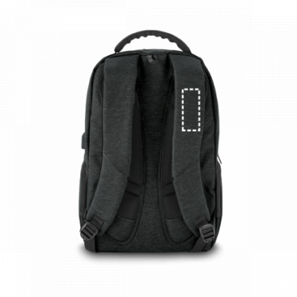 Waterproof 2Tone Nylon laptop backpack with 2 compartments. Lined rear compartment with interior zipped pocket and padded partition for laptop up to 17”. Lined front compartment with several interior pockets. The backpack has 2 front pockets and 2 side pockets. USB port and USB/micro USB cable to connect to mobile devices. Padded straps and back with padded support system for the back. Accessories not included. Capacity up to 26 L. 310 x 470 x 200 mm