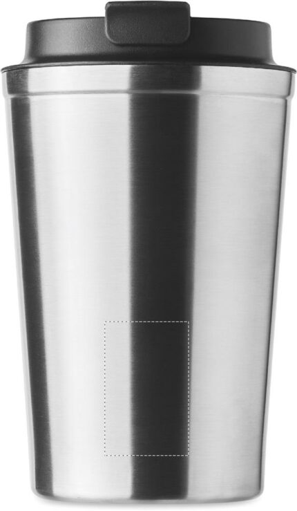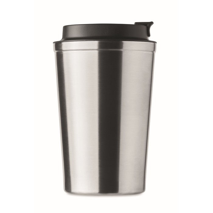 Double wall stainless steel tumbler with PP lid. Capacity: 350 ml. Leak free.