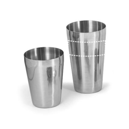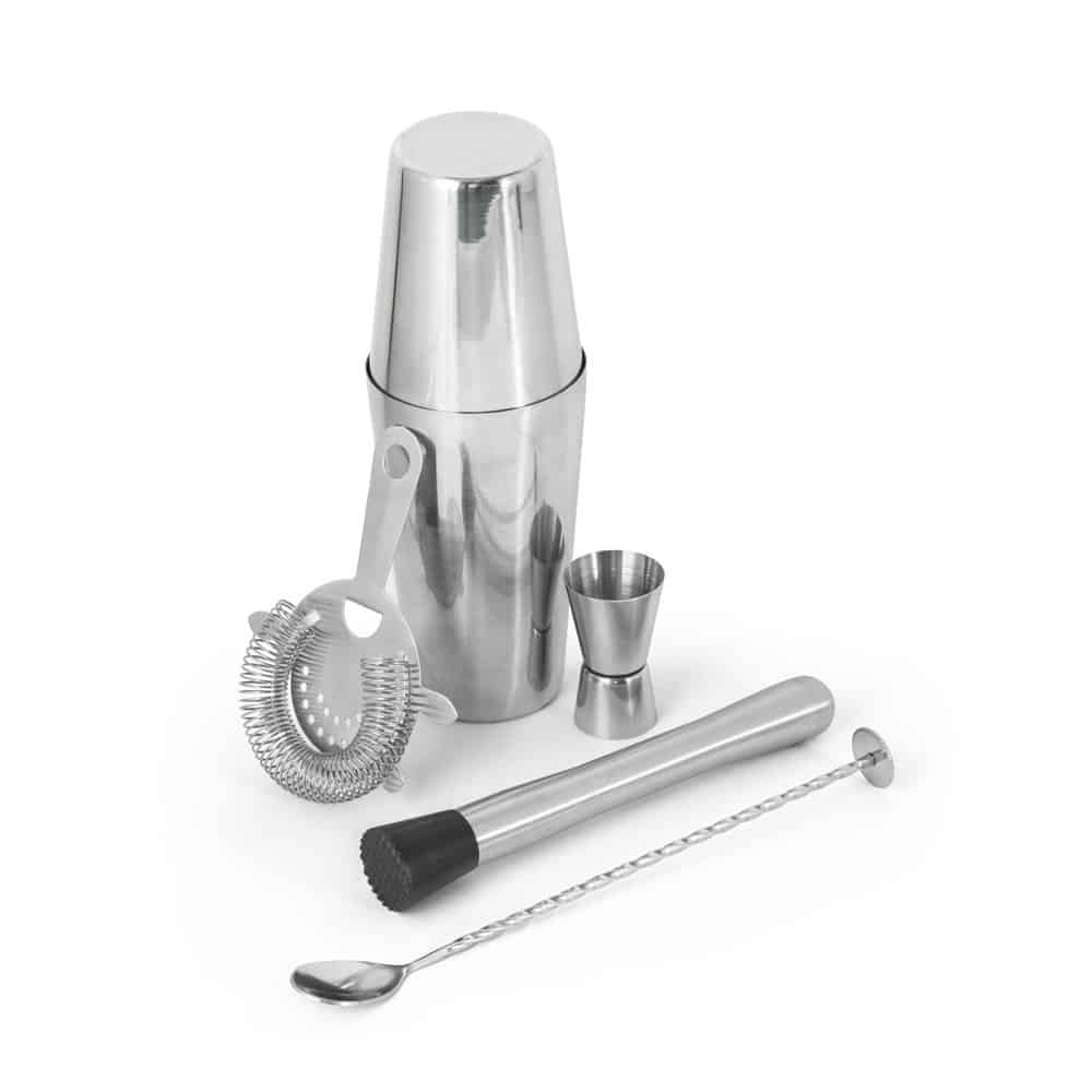 6-piece stainless steel cocktail set: a shaker (600 + 450 mL), a measuring cup (30 mL), a spoon, a pestle and a strainer. Includes a non-woven pouch. Supplied in a gift box. Box: 98 x 98 x 290 mm
