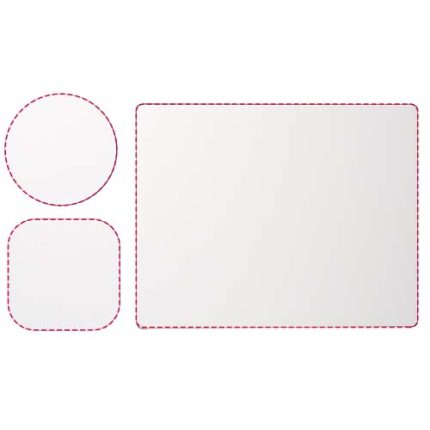 Supplied with a Brite-Mat mouse mat and a set of matching coasters. The set comprises of a rectangular mousemat (0.3 x 19 x 21cm), square coaster (0.3 x 9.5 x 9.5 cm) and round coaster ( 0.3 x  ø9.5cm).