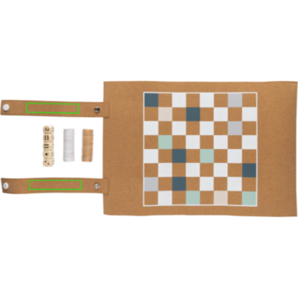 This foldable backgammon and checkers game set is a modern high-quality board game set featuring a brown cork playing surface and playful colours. It is foldable for easy storage and transport, and comes with playing pieces and a dice. With its classic design and durable playing pieces, it’s a great option for anyone who loves these classic board games and wants a set that can be easily transported and stored.