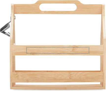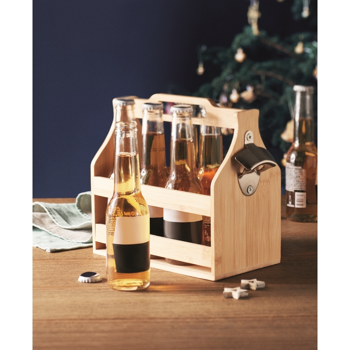 Carry crate in bamboo including a metal bottle opener. It fits 6 traditional glass beer bottles. Bamboo is a natural product, there may be slight variations in colour and size per item, which can affect the final decoration outcome.
