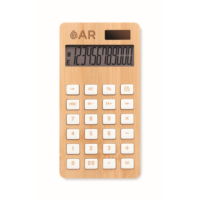 12 digit calculator dual power in ABS with bamboo case. 1 cell battery (LR1131) included.