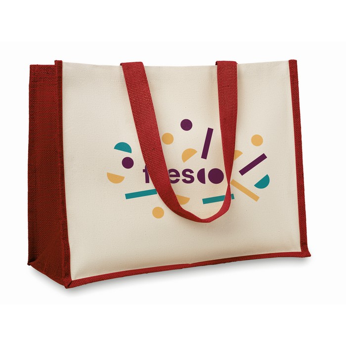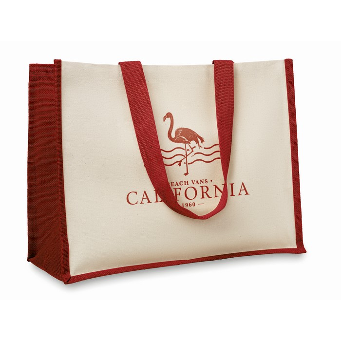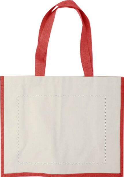 Jute shopping bag laminated with front in canvas and cotton webbing. Long handles.