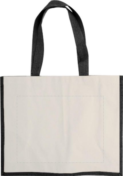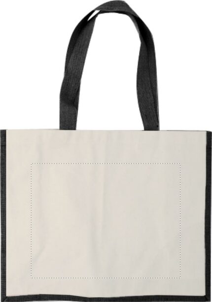 Jute shopping bag laminated with front in canvas and cotton webbing. Long handles.