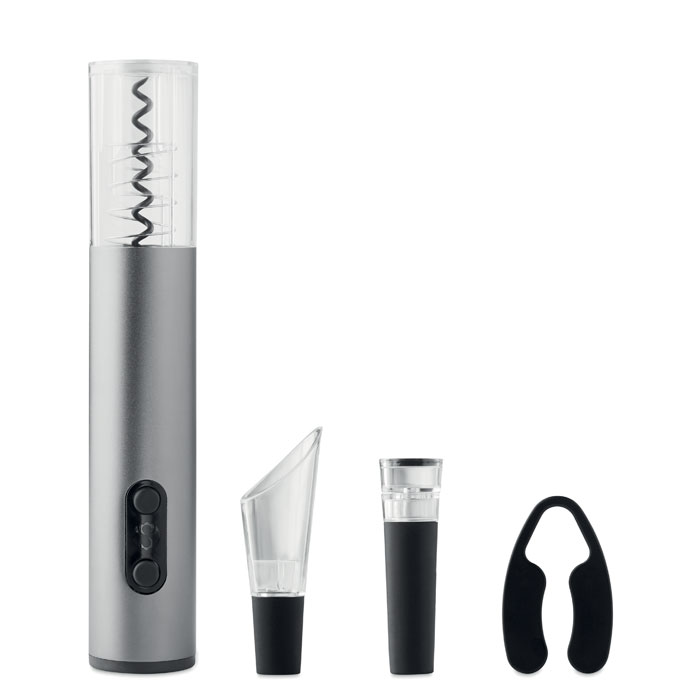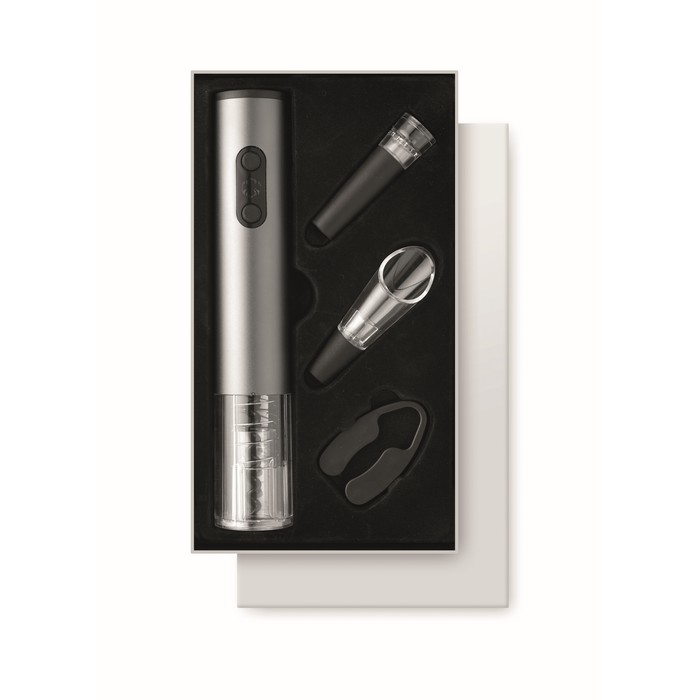 Wine set presented in a gift box. With wine stopper, pourer, foil cutter and an electric bottle opener. 4 AA batteries not included.