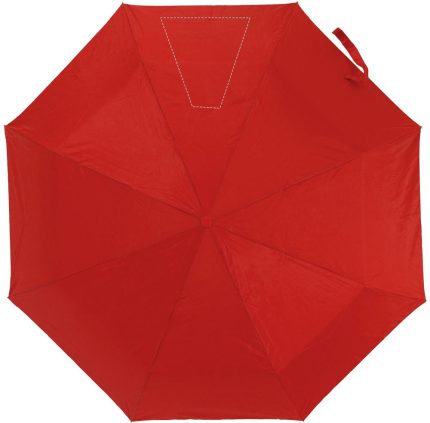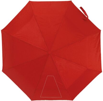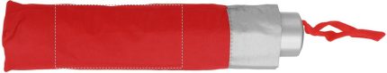 21 inch manual open umbrella in 190T polyester with zincify plating metal shaft and tips. Black plating metal ribs. Panels in colour with silver coating on back. Plastic handle in color with silver rim and black wrist strap. 3 sections fold. Includes matching pouch with silver trim. Manual closure.