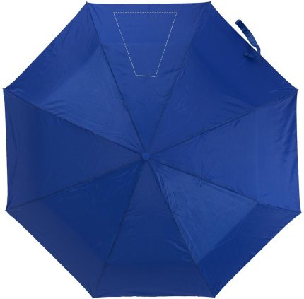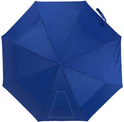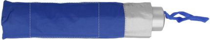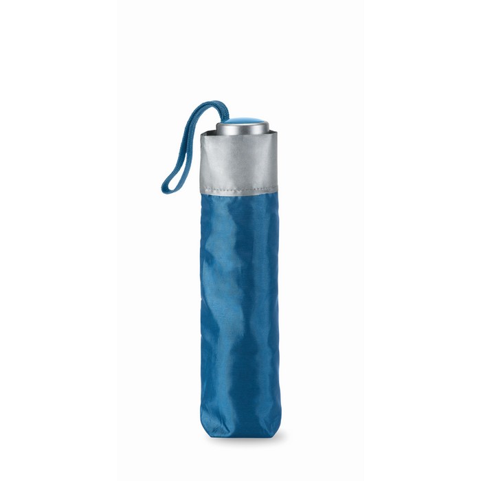 21 inch manual open umbrella in 190T polyester with zincify plating metal shaft and tips. Black plating metal ribs. Panels in colour with silver coating on back. Plastic handle in color with silver rim and black wrist strap. 3 sections fold. Includes matching pouch with silver trim. Manual closure.