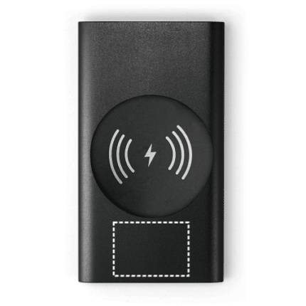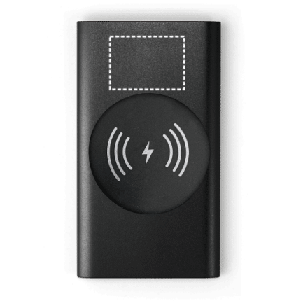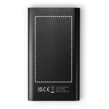 Aluminium portable battery and wireless charger. Contains a lithium polymer battery. It contains a capacity of 4.000 mAh and a lifespan of ≥ 500 cycles. 5V/2A input and 5V/2A output, with LED charge indicator. Includes USB/micro USB cable to charge the battery. Supplied in a gift box. 123 x 70 x 10 mm