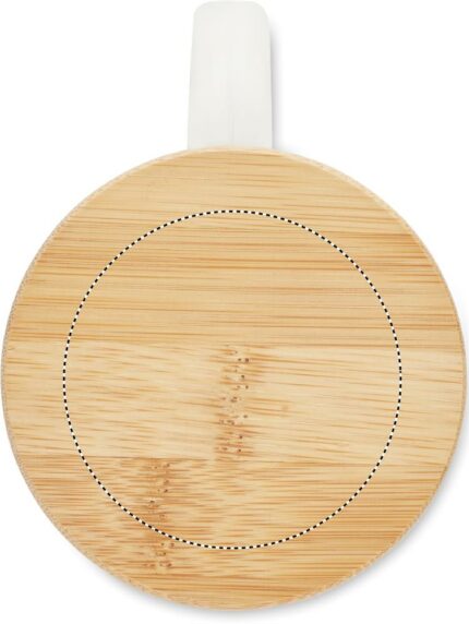 Recycled glass mug with bamboo lid. Capacity: 300 ml. Bamboo is a natural product, there may be slight variations in colour and size per item, which can affect the final decoration outcome.