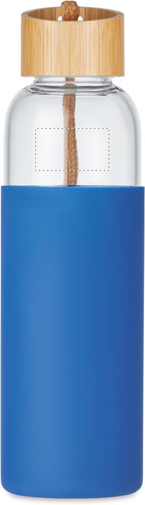 Glass bottle with silicone pouch and bamboo lid with cotton wrist loop. Not suitable for carbonated drinks. Leak free. Capacity: 500 ml.
