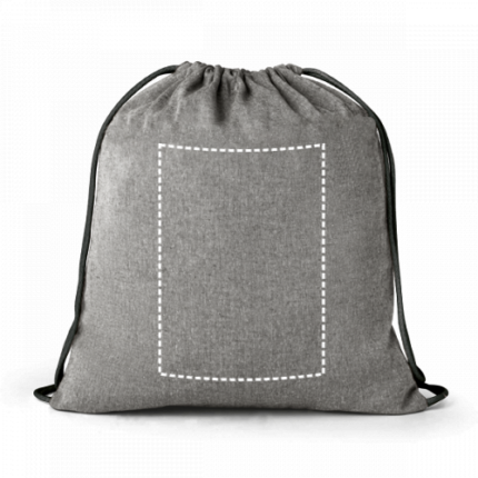 Drawstring bag in recycled cotton (140 g/m²), with front pocket with discreet zipper and handles in cotton. 370 x 410 mm