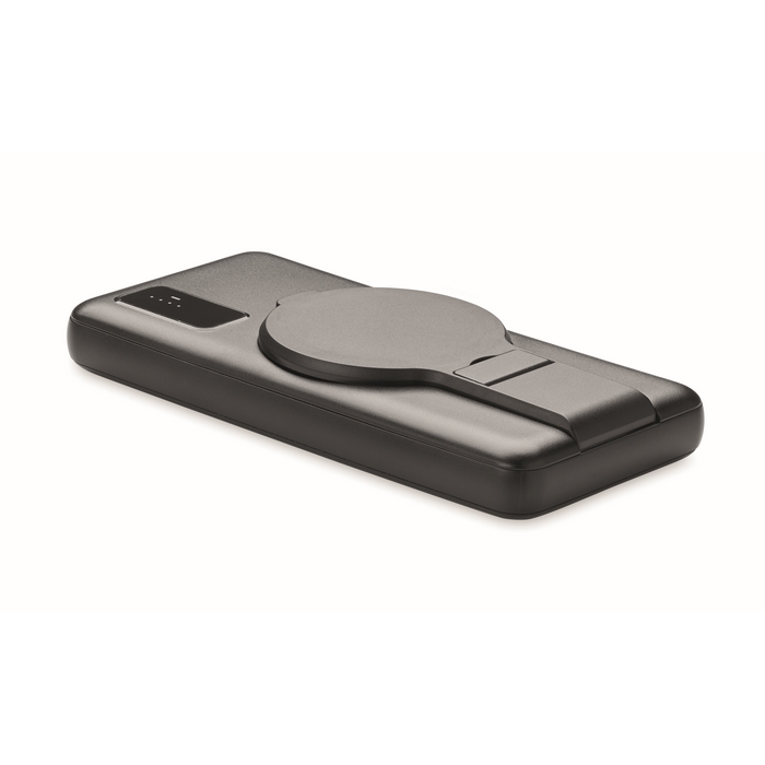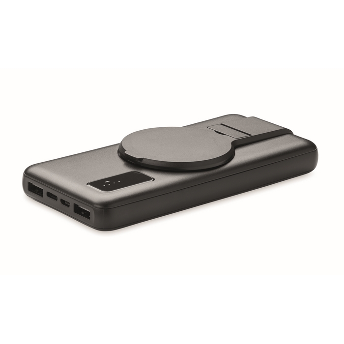 Magnetic wireless charger (15W), power bank (10000 mAh) in ABS and magnetic phone stand functionality. Input: micro B, Type-C . Output 2x USB-A In/ Type-C/ DC 9V/1.66A (15W) ideal for quick charging. Compatible with iPhone® 12 and newer. Includes additional magnetic metal ring to support charging of non-magnetic wireless chargeable phones. Power delivery (PD) support to charge the newest laptop MacPro®.