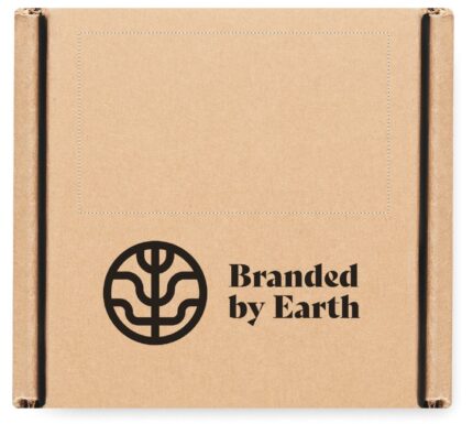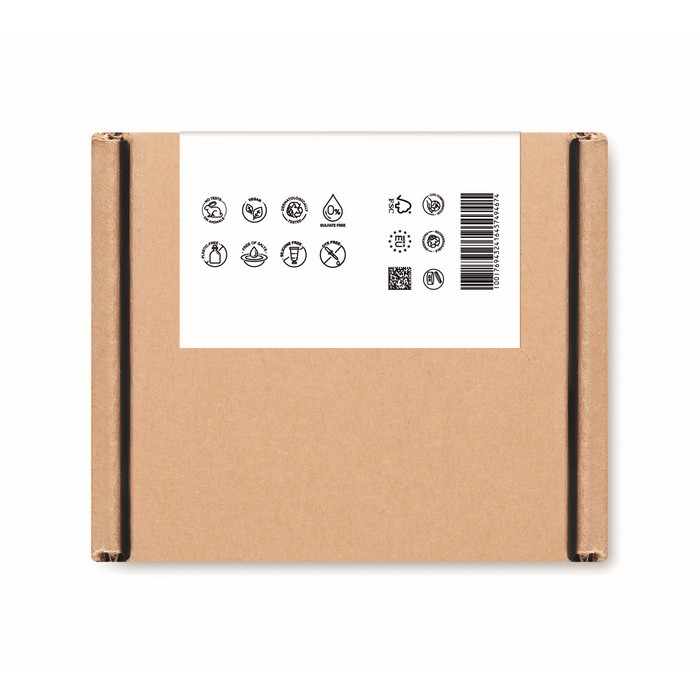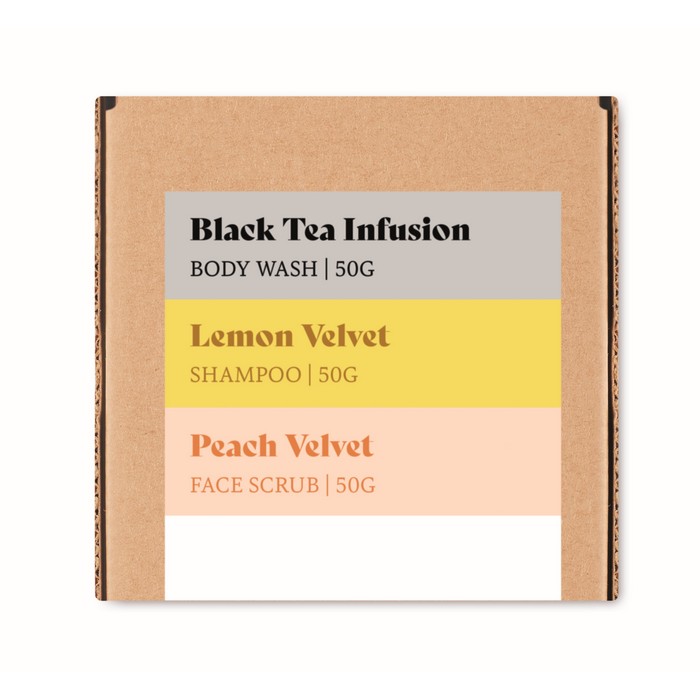Unisex Travel gift set by Branded By Earth. Includes vegan 50gr of body wash, shampoo and face scrub. All pieces packed in can. Presented in recycled paper box. Made in EU.