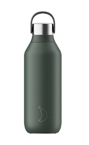 Ένα πράσινο μπουκάλι νερού CHILLYS 2 με εκτύπωση, πά.