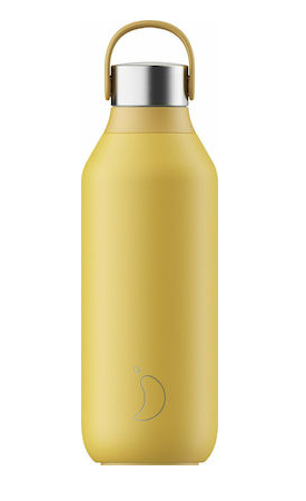 Ένα κίτρινο μπουκάλι νερού CHILLYS 2 σε ένα λευκό φόντο.