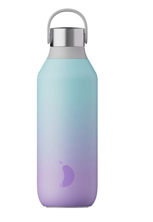 Ένα μπουκάλι νερού με όμπρε CHILLYS 2,με εκτυπώσεις μωβ και μπλε.