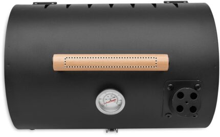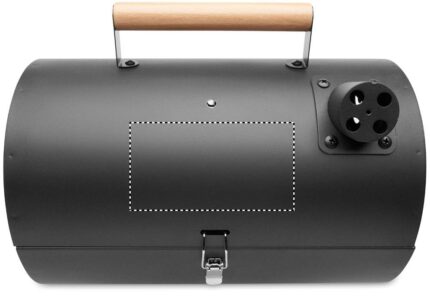 Portable barbecue barrel in iron with chimney and temperature gauge. Black firebox. Locking catch and wooden carry handle.
