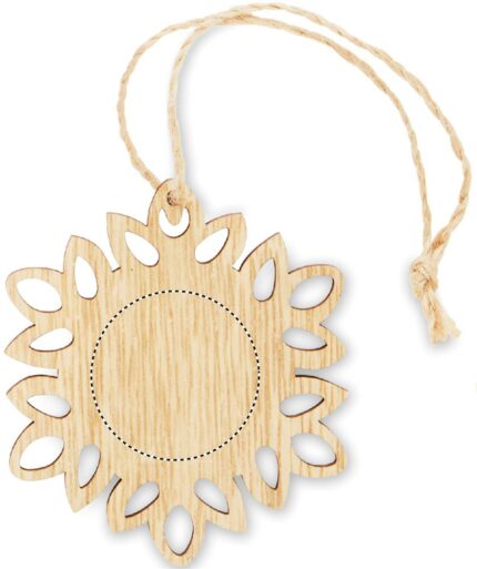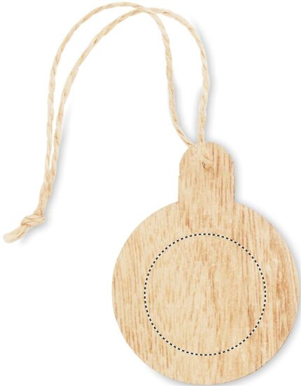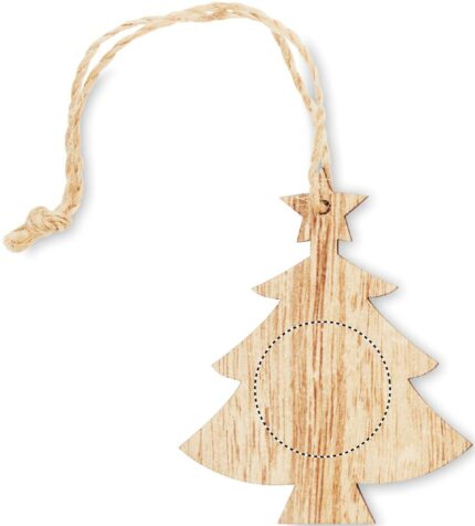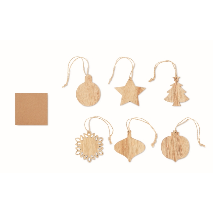 Set of 6 beech wooden Christmas ornaments with jute cord. Designs: baubles, tree, and snowflake shaped hangers. Presented in a kraft box.