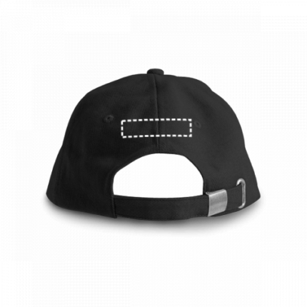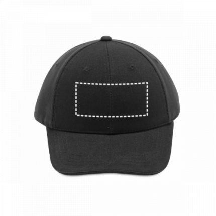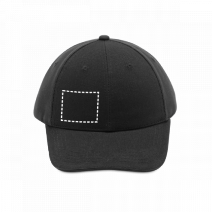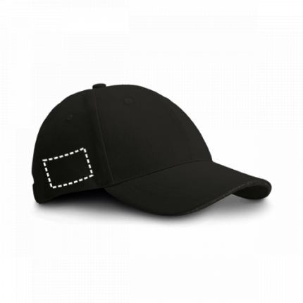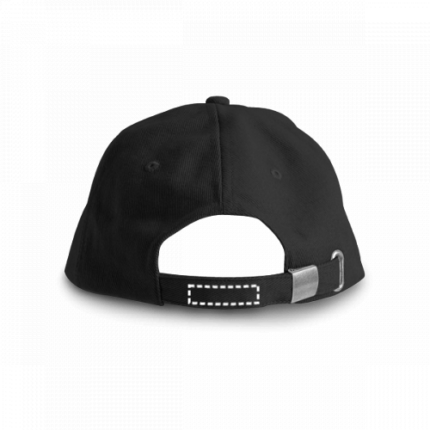 100% brushed cotton “sandwich” cap with 6 panels and eyelets (260 g/m²). Adjustable with a metal buckle. Size: 580 mm