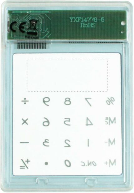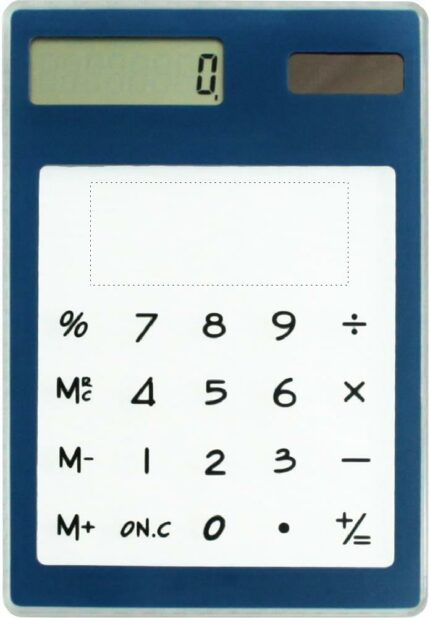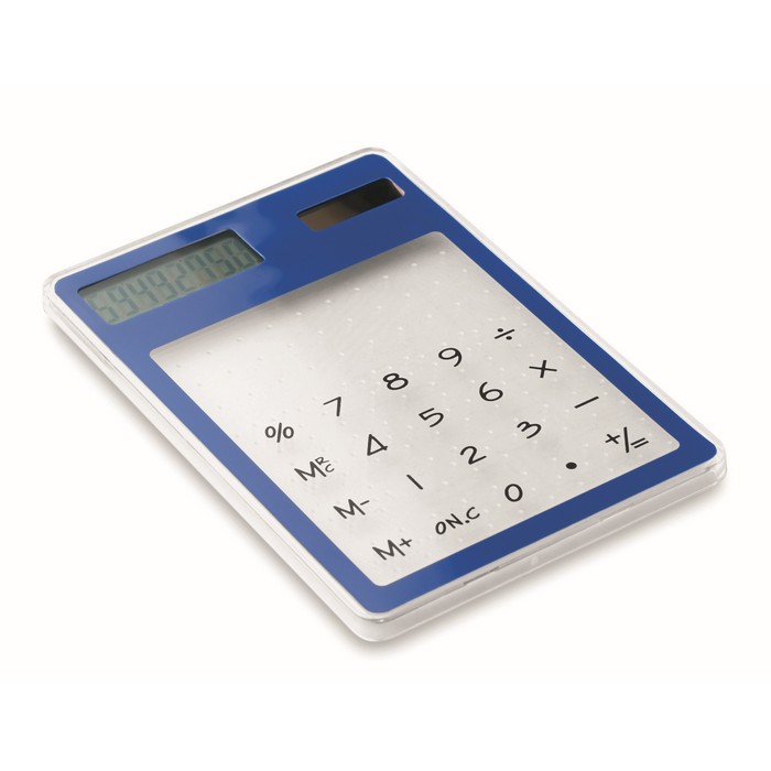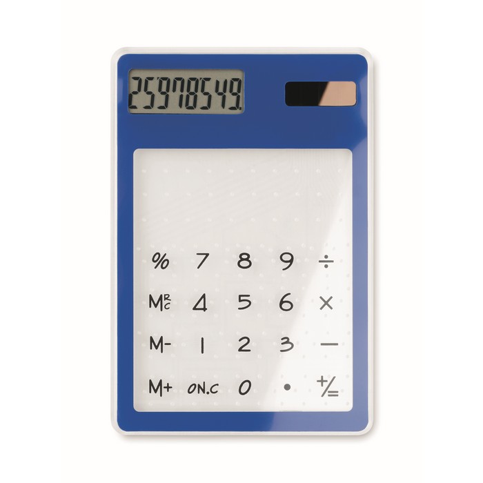 8 digit, transparent shell, touch screen calculator. Powered by solar panel in ABS housing.