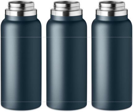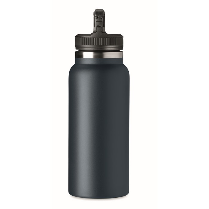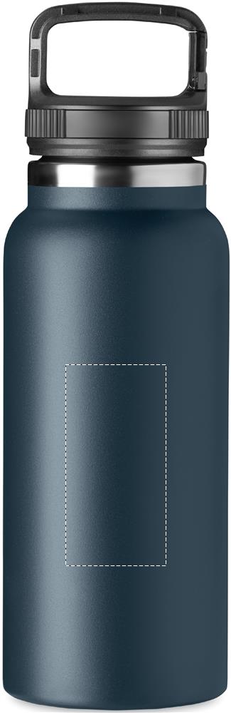 Double wall stainless steel vacuum insulated bottle with hook hanger on lid. Capacity: 970 ml.