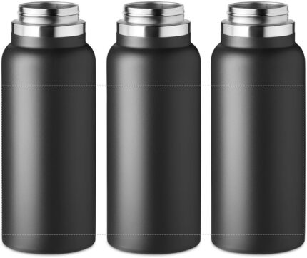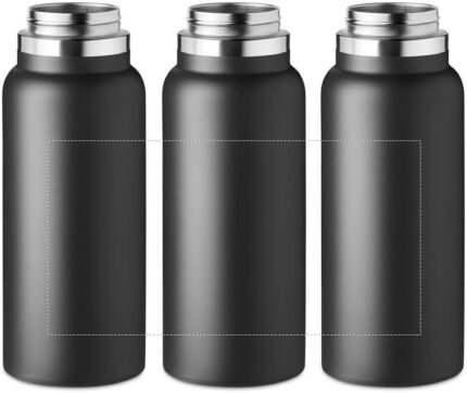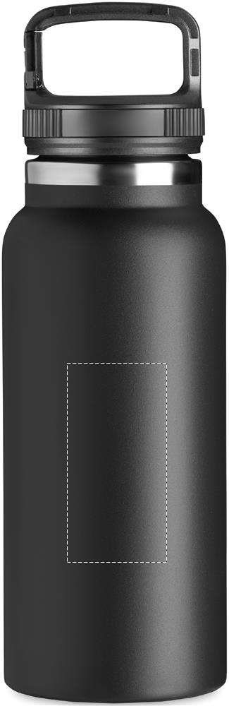 Double wall stainless steel vacuum insulated bottle with hook hanger on lid. Capacity: 970 ml.