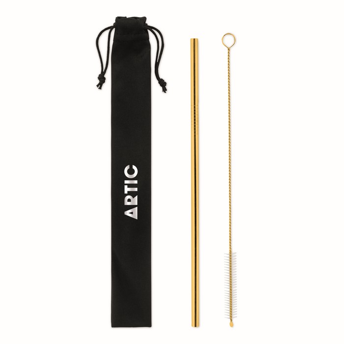 Set of 1 reusable stainless steel drinking straws and cleaning brush in microfiber pouch.