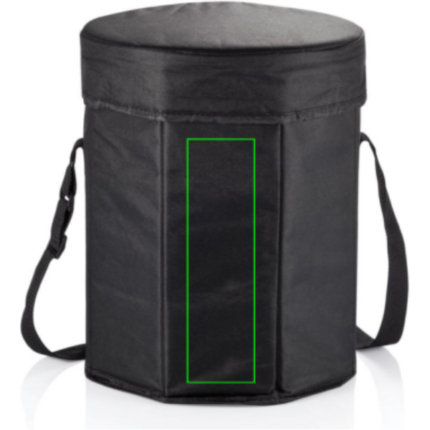 600D polyester in black with PE coating, 30cm diameter, foldable. Usable as cooler and seat.