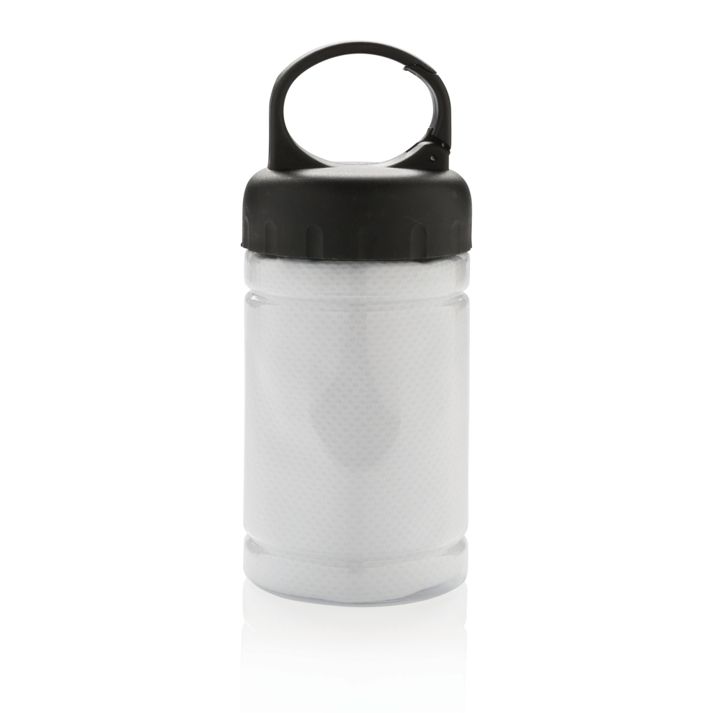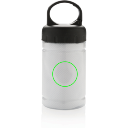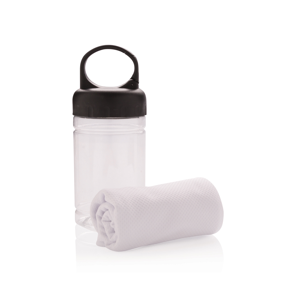 Microfibre cooling towel 100% free of chemicals. 98% sun blocking function up to UV 50+ protection. The towel can be easily used by adding some cold water to the bottle creating a cool towel for fast refreshment. The bottle is made out of PP with ABS top and carabiner to take along on outdoor activities. 77 x 30cm.