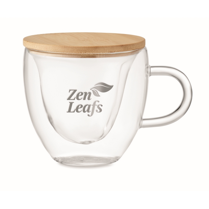 Double wall borosilicate glass mug with heart shape and bamboo lid. Capacity: 180 ml. Bamboo is a natural product, there may be slight variations in colour and size per item, which can affect the final decoration outcome.