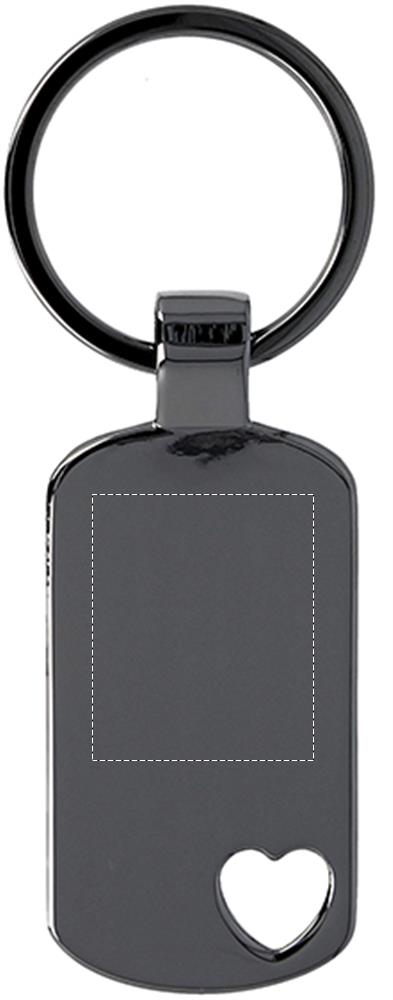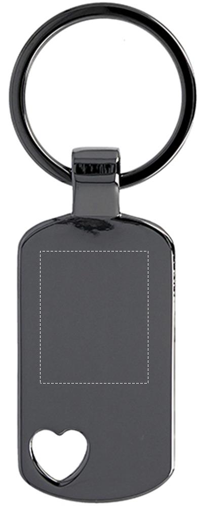 Metal key ring with heart detail on the bottom. Individually packed in box.