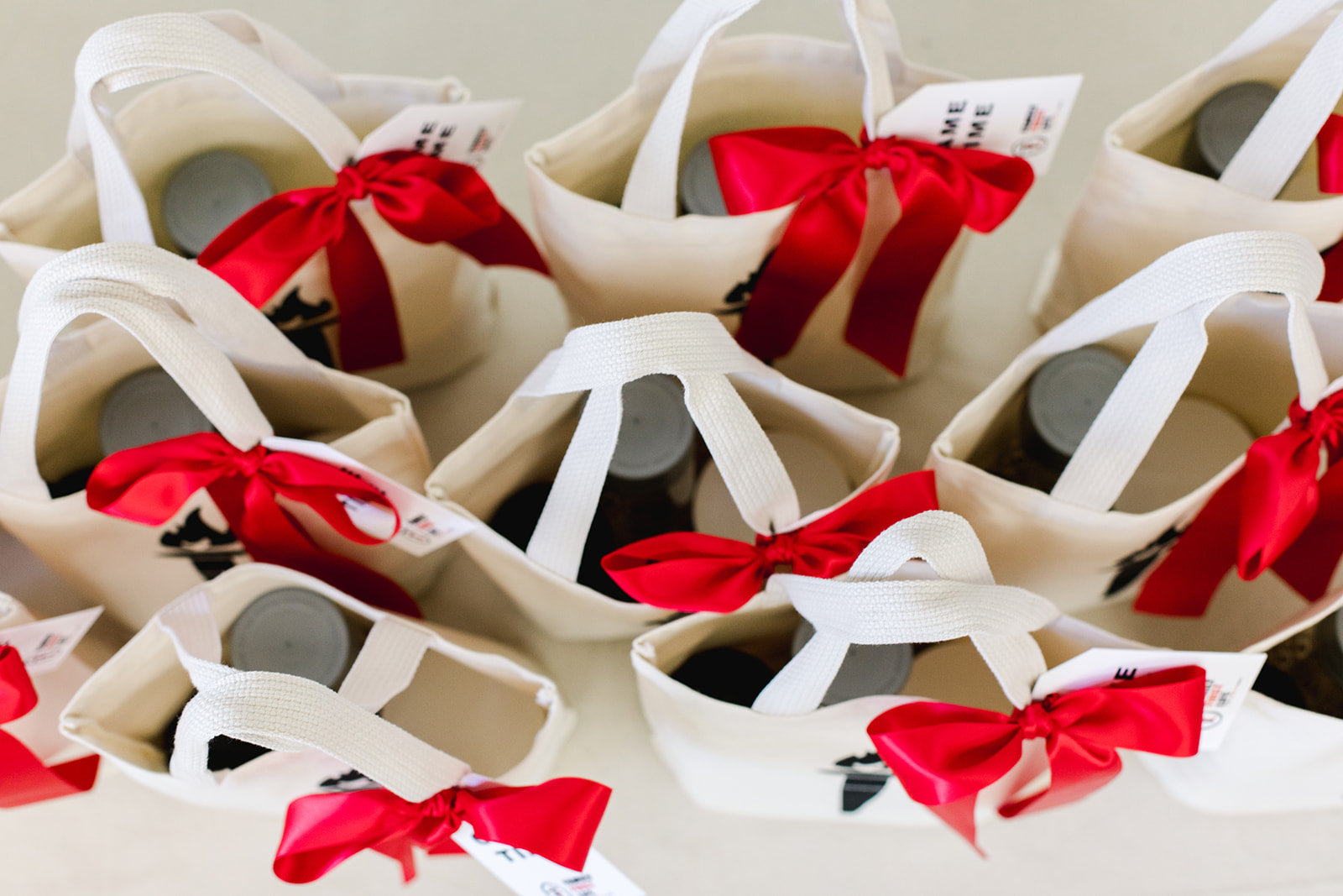 Μια ομάδα λευκών τσαντών με κόκκινες κορδέλες Corporate Event Gift Bags.