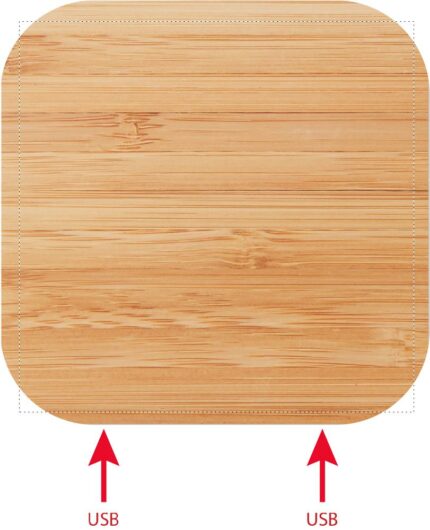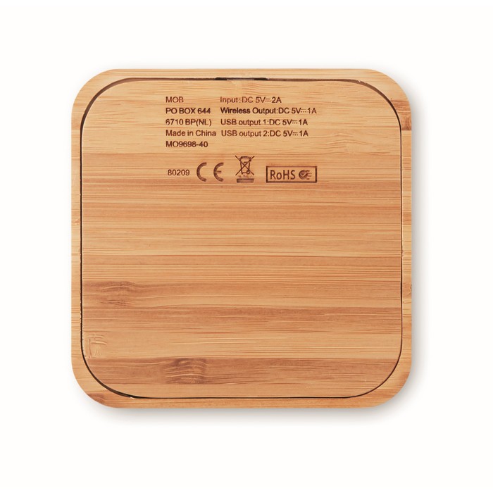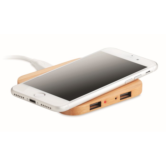 Wireless charging pad with 2 USB port 2.0 hubs in bamboo. Output DC5V/1A (5W). Compatible latest androids, Iphone®8, X and newer. Bamboo is a natural product, there may be slight variations in colour and size per item, which can affect the final decoration outcome.