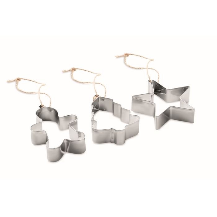 Set of 3 cookie cutters in stainless steel with jute cord. Each can be also used as tree ornament.