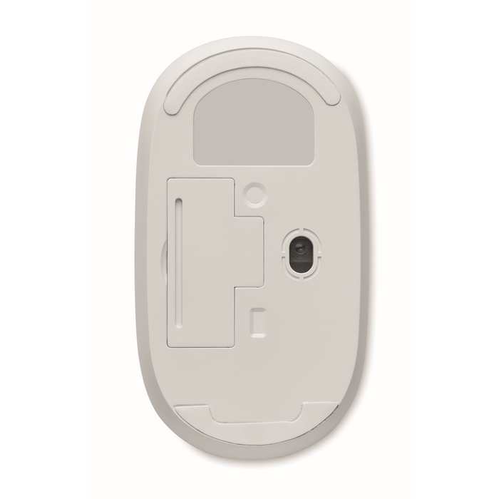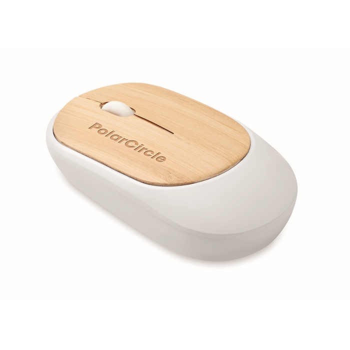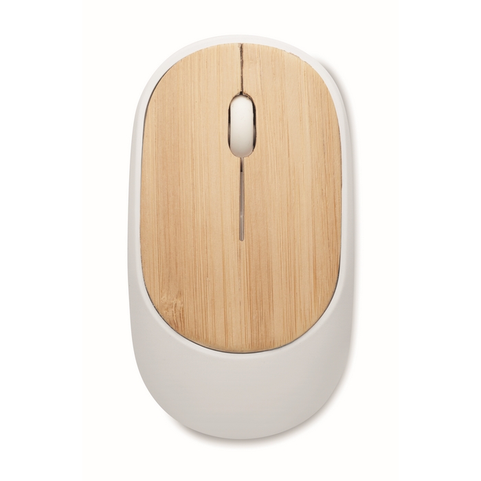 Wireless optical mouse in recycled ABS with bamboo top. 1 AA batteries not included. Bamboo is a natural product, there may be slight variations in colour and size per item, which can affect the final decoration outcome.
