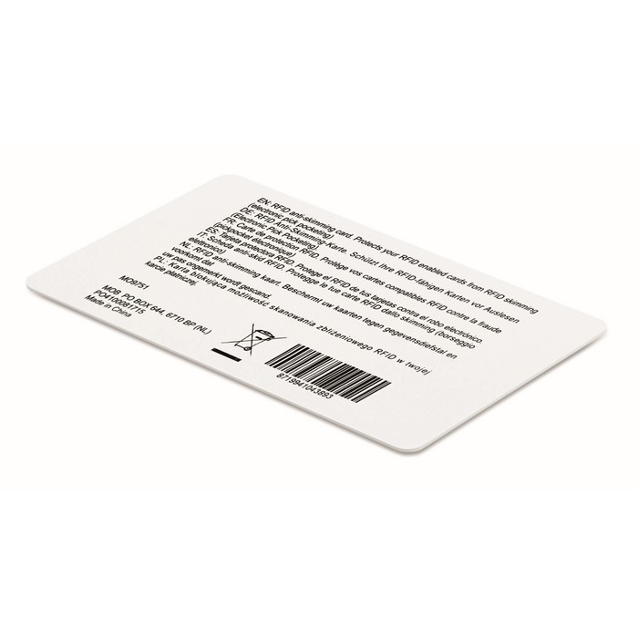 RFID Anti-skimming card. By using an electromagnetic field it makes all 13.56 MHz cards (trains, buses, bank or credit cards) secure from electronic pick pocketing 2-3 cm around the card. (0,9 mm).