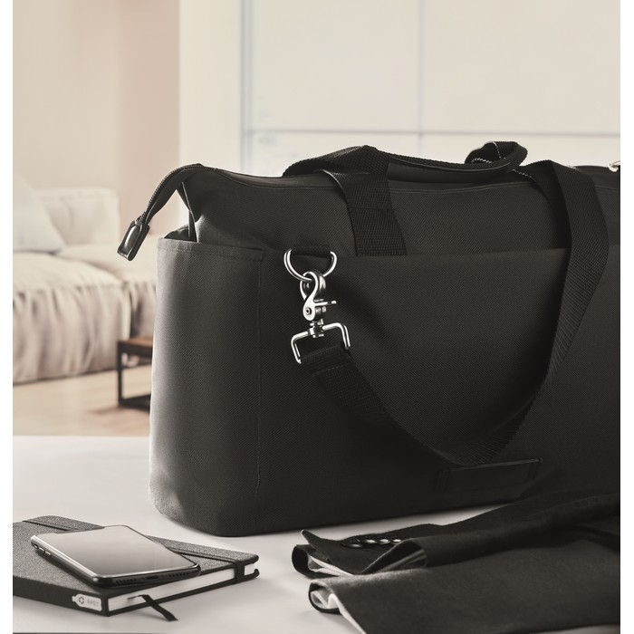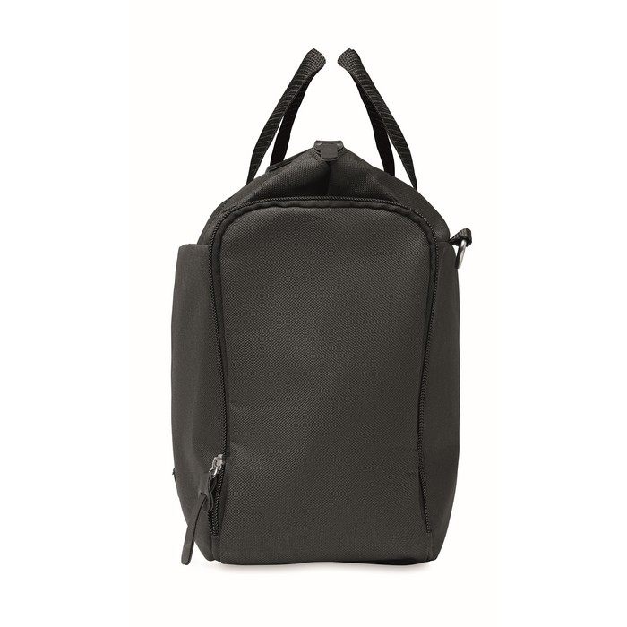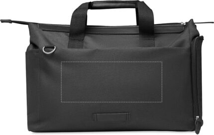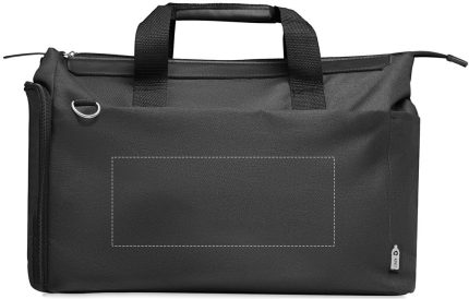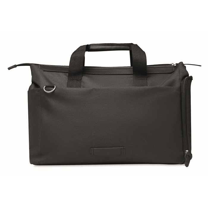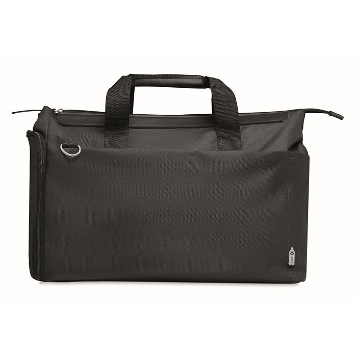 600D 2 tone RPET messenger bag with several zippered pockets and padded 15 inch laptop compartment. Adjustable and detachable shoulder strap.