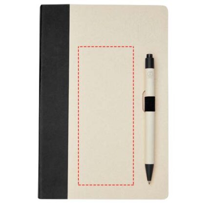 A5 size reference notebook and ballpoint pen set. The notebook features 80 lined sheets (80 g/m²) made from recycled milk cartons (up to 70%), a coloured paper spinal, and a pen loop. In the pen loop, there is a click-action ballpoint pen in matching colour of the notebook. The pen has a barrel made of the same recycled milk carton material and the button, clip, and tip is made of coloured PLA plastic. The pen features a black refill inside. Used milk cartons are collected, sorted, processed, and turned into paper, truly turning waste into something useful.