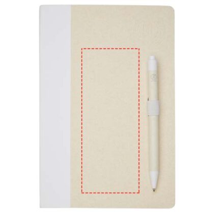 A5 size reference notebook and ballpoint pen set. The notebook features 80 lined sheets (80 g/m²) made from recycled milk cartons (up to 70%), a coloured paper spinal, and a pen loop. In the pen loop, there is a click-action ballpoint pen in matching colour of the notebook. The pen has a barrel made of the same recycled milk carton material and the button, clip, and tip is made of coloured PLA plastic. The pen features a black refill inside. Used milk cartons are collected, sorted, processed, and turned into paper, truly turning waste into something useful.