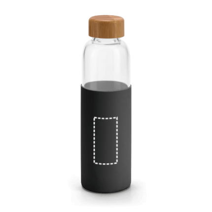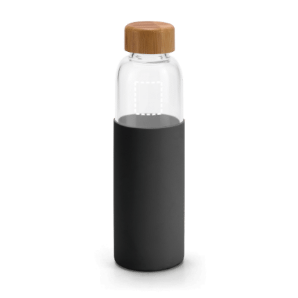 Borosilicate glass bottle with bamboo screw-on lid and silicone pouch. This bottle has a volume-capacity of 600 mL. Supplied in a Kraft paper box. ø68 x 231 mm