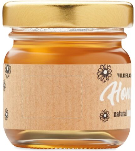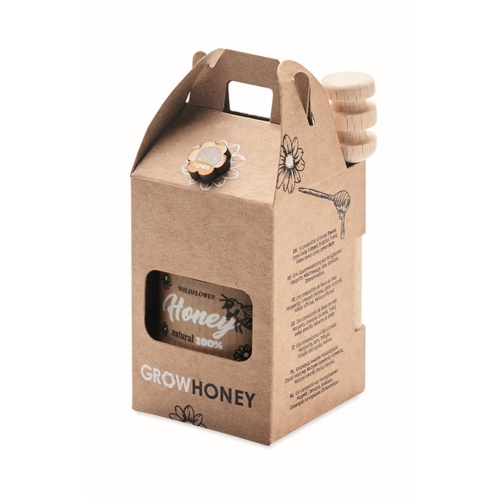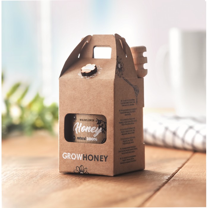 Wildflower honey jar (50g) with a wooden honey dipper. Comes in a kraft paper box. Including honey bee flower seeds. Made in EU. Not available for sale in the UK.