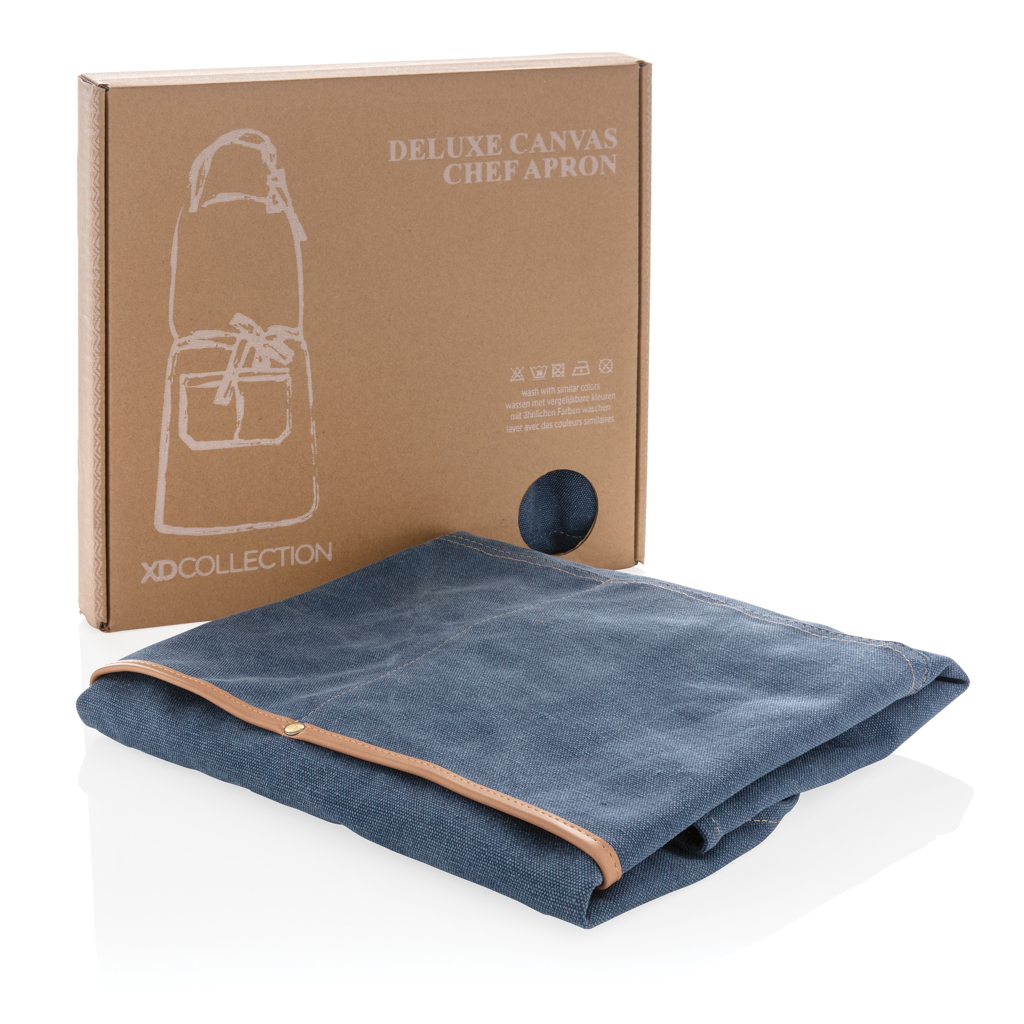Be a top chef in this beautiful apron made in a heavy quality 16oz. canvas with PU accent details. With a one-size design, it has adjustable straps at the neck and on the sides. A large pocket comes in handy for storing notes and utensils. Supplied in a Kraft gift box. Machine wash at 30 degrees celsius with similar colours.